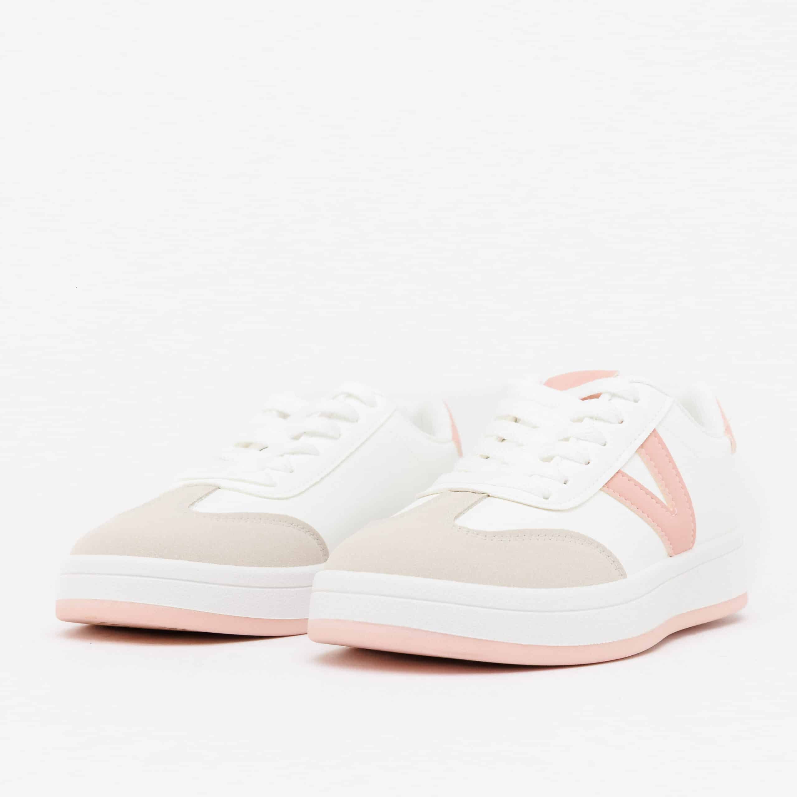 تألقي بإطلالة “الكلين جيرل” (Clean Girl Look) مع هذا السنيكرز الأبيض العصري. يتميز بتصميم انسيابي يجمع بين الجلد الأبيض الناعم ولمسات من الشامواه الفاخر في المقدمة، مع شعار “V” جانبي بألوان ناعمة (الوردي الباستيل أو البيج الرملي). مزود بنعل مطاطي مرن يوفر راحة فائقة للمشي اليومي. الخيار الأمثل للجامعة، العمل، والنزهات الصيفية.