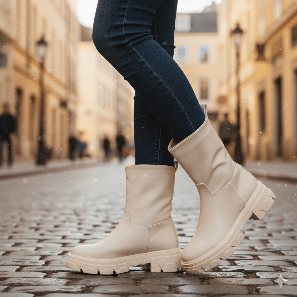 حذاء شتوي مستورد فاخر للنساء – تصميم عصري بنعل سميك مريح ولون فاتح أنيق