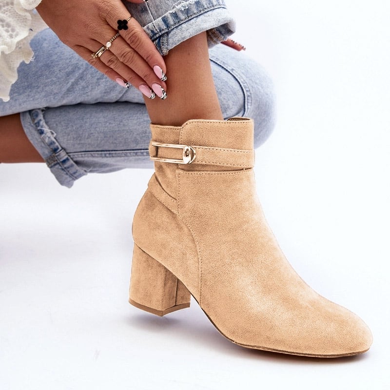اللون البيج يأتي بملمس مخملي ناعم مع حزام جانبي مزين بإبزيم معدني يعطي الحذاء لمسة راقية.
