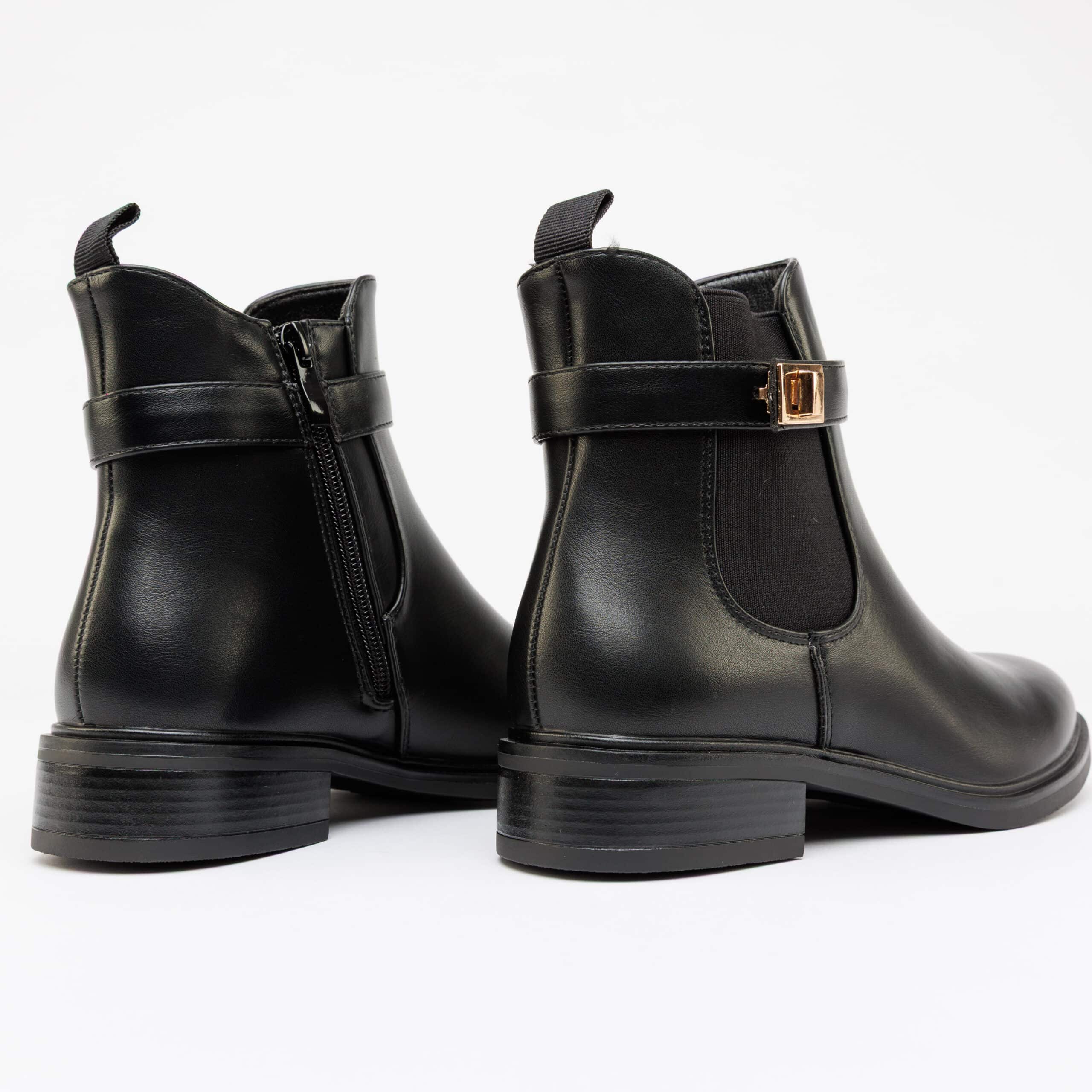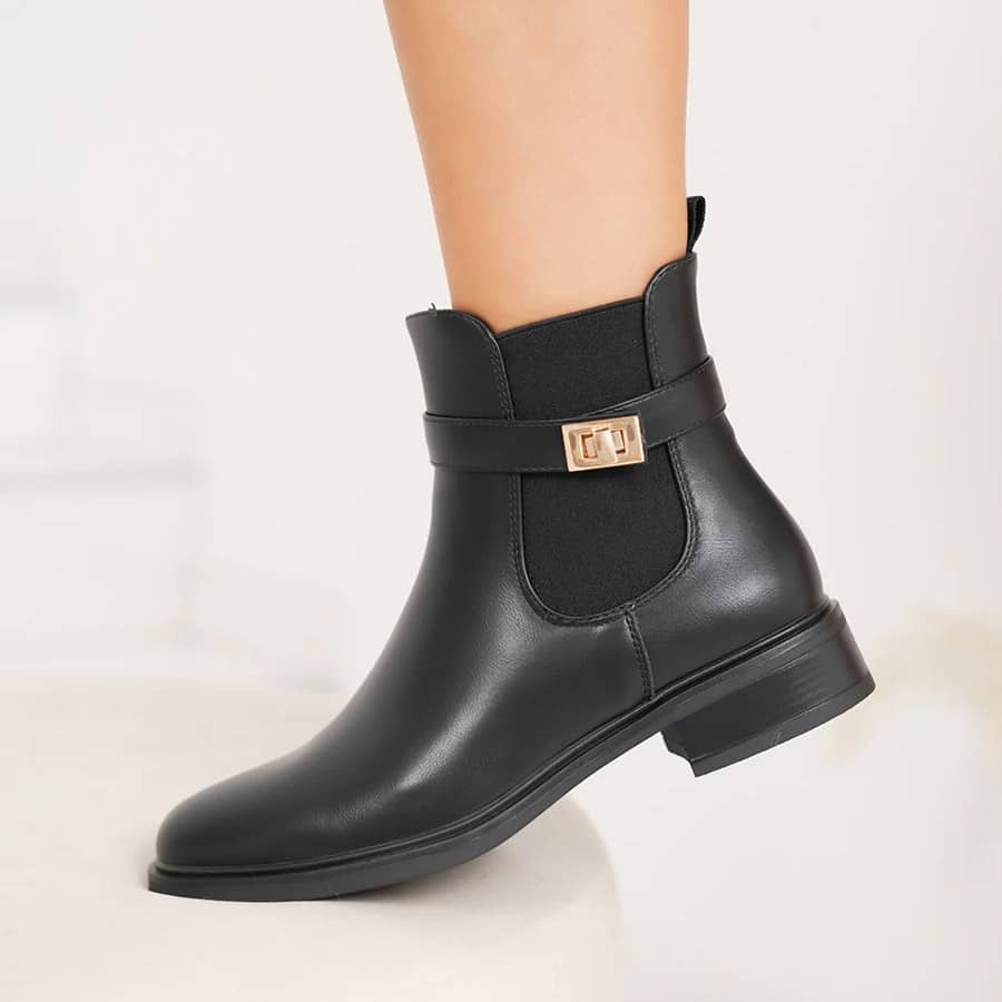 أما الإبزيم الجانبي المعدني فيضفي لمسة فاخرة على التصميم، إذ يبرز جمال الحذاء ويضيف له هوية خاصة. يأتي الإبزيم بلون معدني فاخر يتناسب بشكل جميل مع اللون الأسود الغني، مما يمنحك مظهرًا جذابًا يبرز شخصيتك الراقية.