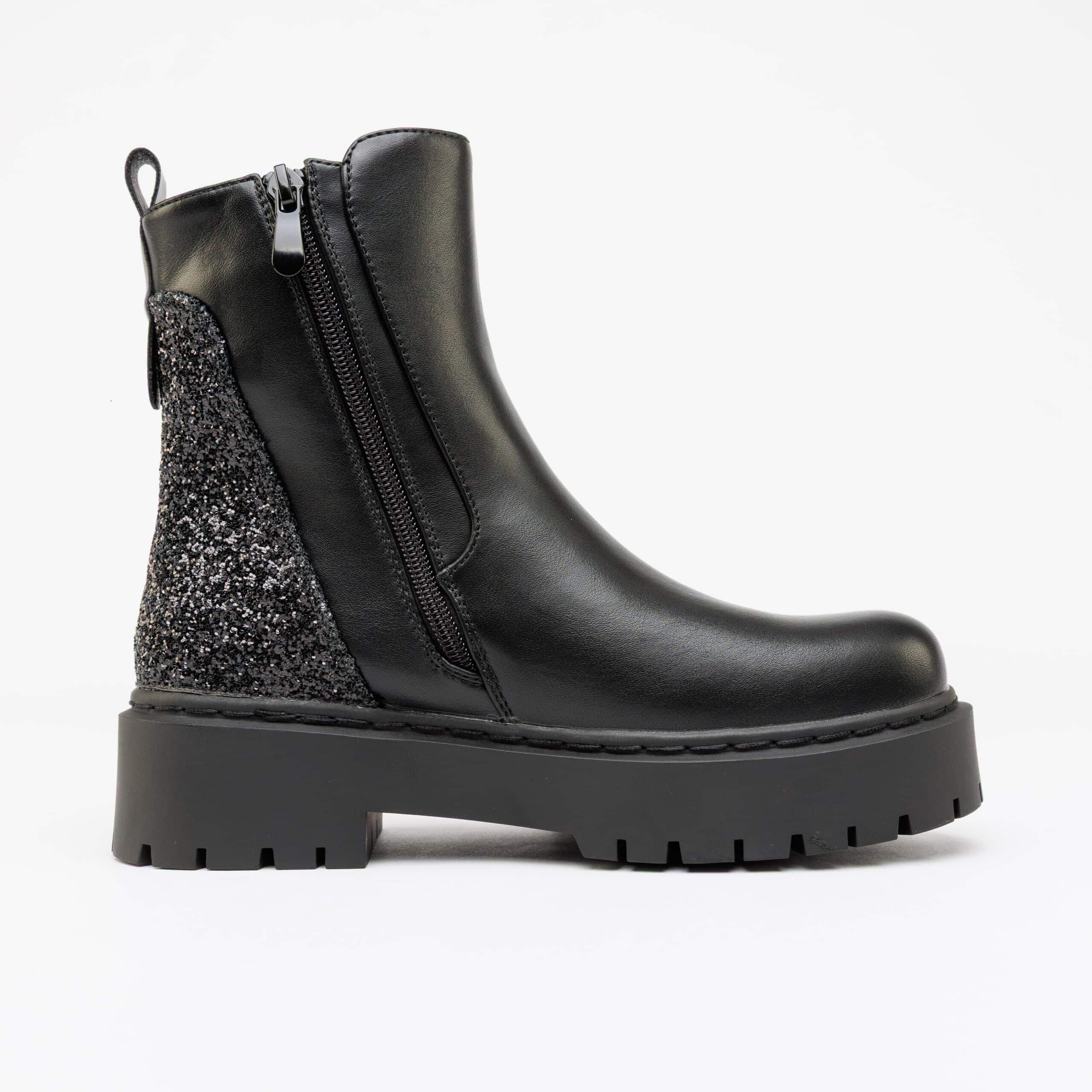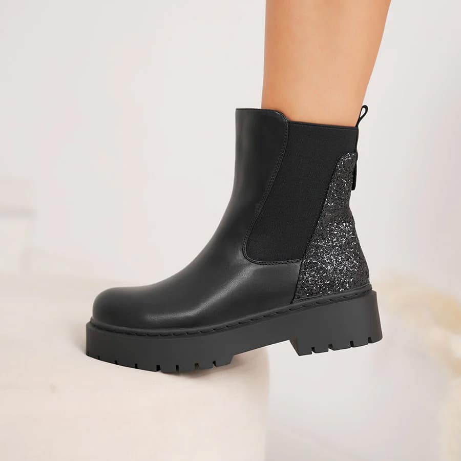 يأتي الحذاء بقصة تصل إلى منتصف الساق (Ankle Boot)، وهي من أكثر القصّات العملية التي تناسب مختلف الإطلالات اليومية. يتميز الجزء الأمامي بخامة جلدية ناعمة ومتينـة تمنح الحذاء مظهرًا راقيًا، كما تساعد في مقاومة رذاذ المطر والبرد، مما يجعل هذا الحذاء مناسبًا للأيام الباردة والطقس الشتوي المتقلب. اللون الأسود الكلاسيكي يمنحه لمسة من الفخامة والبساطة، ويجعله سهل الدمج مع جميع أنواع الملابس.