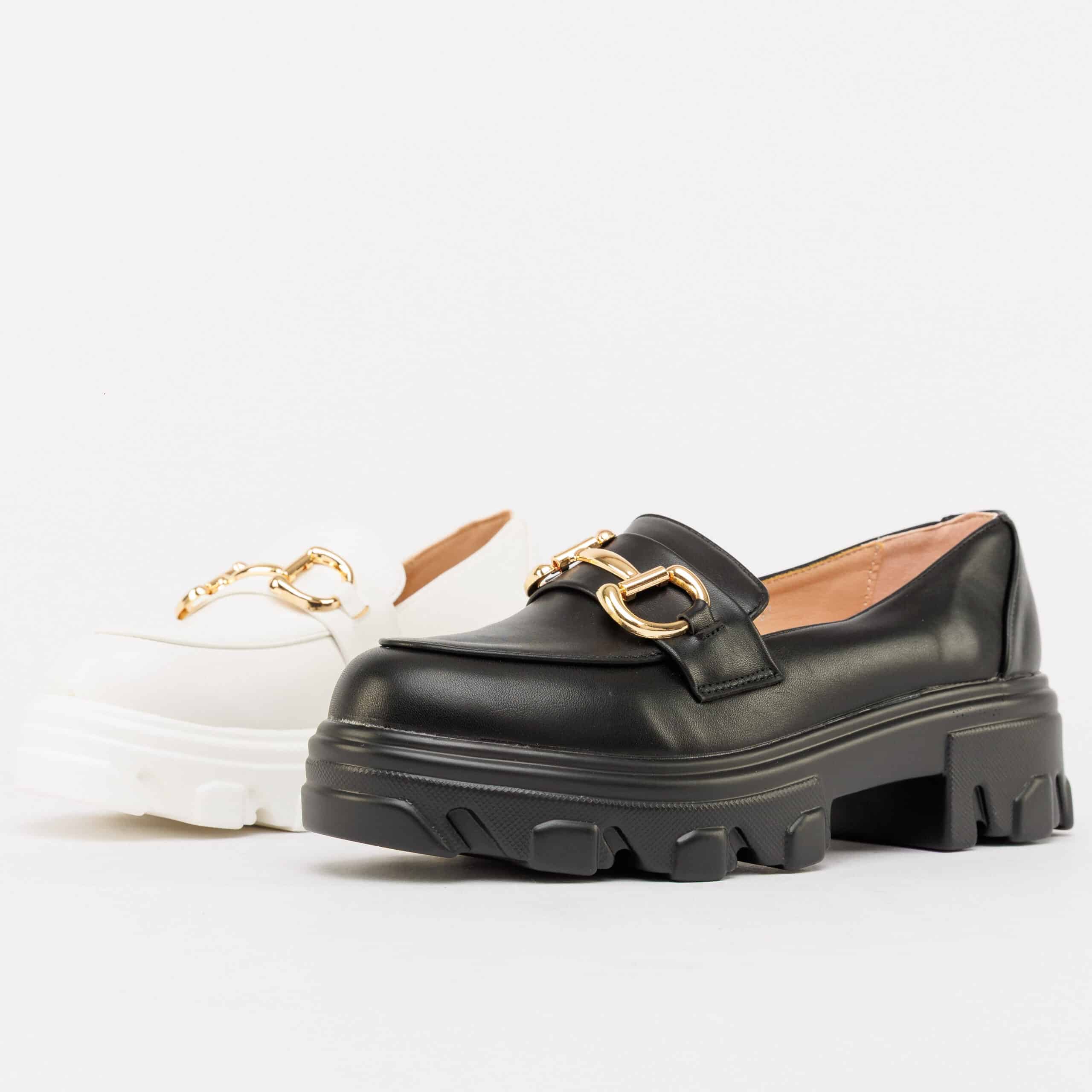 يتميز هذا اللوفر بلونه الأسود الكلاسيكي، وهو لون يظل دائمًا على الموضة ويسهل تنسيقه مع مختلف الملابس. الجزء الخارجي للحذاء مصنوع من خامة ناعمة تشبه الجلد الفاخر، تمنح الحذاء مظهرًا راقياً ومتيناً. يضيف الإبزيم الأمامي الذهبي اللامع لمسة فخامة تلفت الأنظار وتخلق توازناً رائعاً بين البساطة وجاذبية التصميم. تأتي السلسلة الأمامية بشكل أنيق ومتماسك، مما يجعلها العنصر الأساسي الذي يرفع مستوى جمال هذا الحذاء.