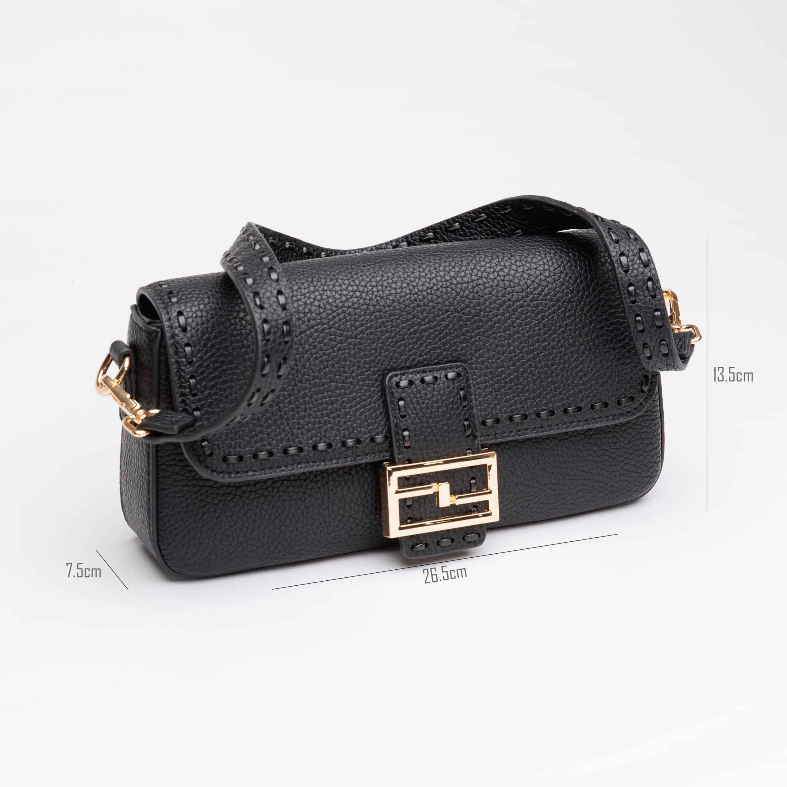 التطريز الجلدي (Whipstitch Detailing): السمة الأبرز في هذا الموديل هي الخياطة الجلدية السميكة التي تلتف حول غطاء الحقيبة وحزام الكتف. هذا النمط من التطريز يعطي الحقيبة مظهراً “هاند ميد” (Handcrafted) فاخراً ويضيف عمقاً للتصميم الأسود السادة.