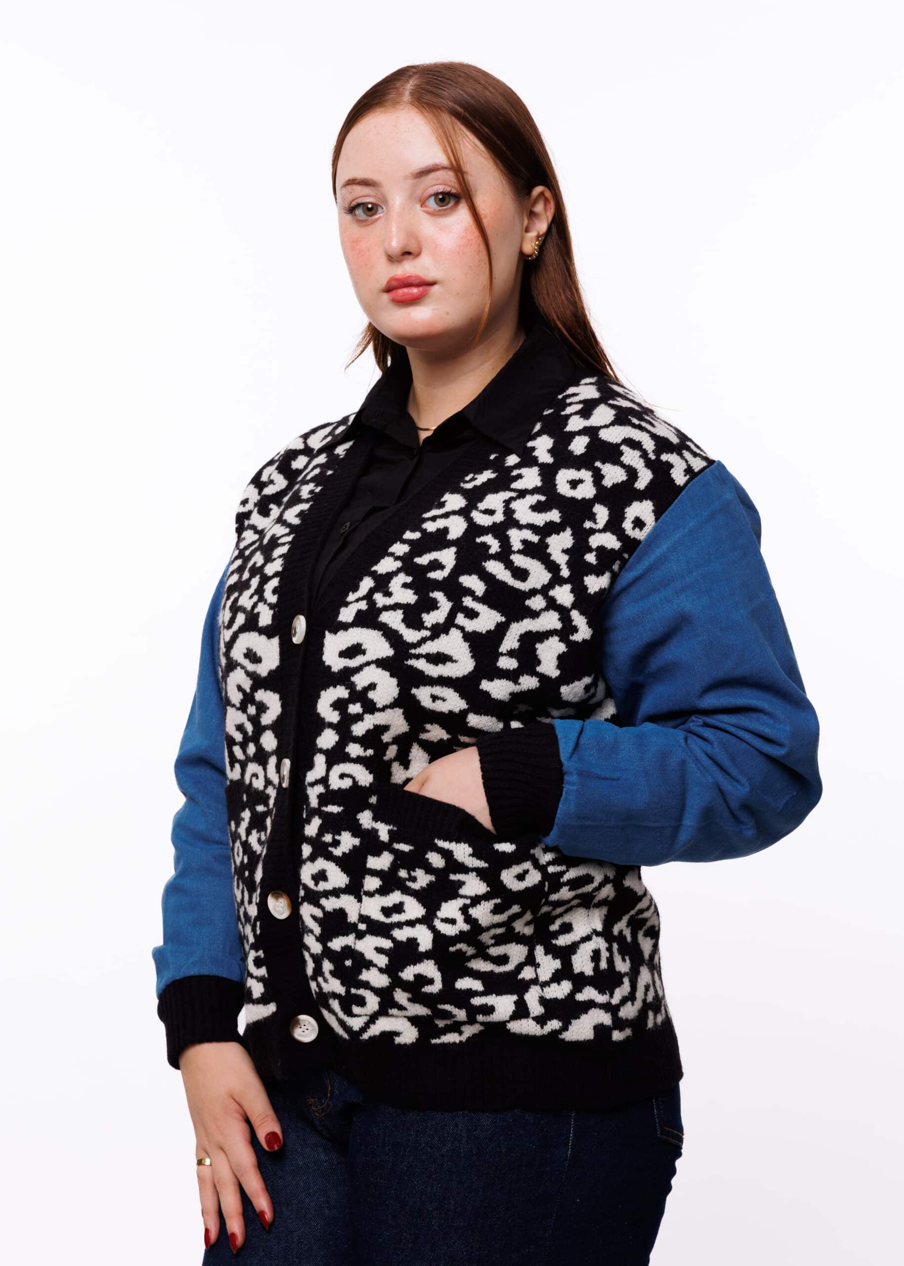 النسيج الصوفي المستخدم يتميز بملمس ناعم يمنح شعورًا بالدفء المريح دون أن يسبب ثقلًا أو حكة على البشرة، بينما تضيف خامة الجينز لمسة من التماسك والحيوية. هذه السترة ليست مجرد قطعة ملابس، بل قطعة عصرية تعبّر عن شخصية قوية وواثقة تحب أن تبرز بأسلوبها الفريد.