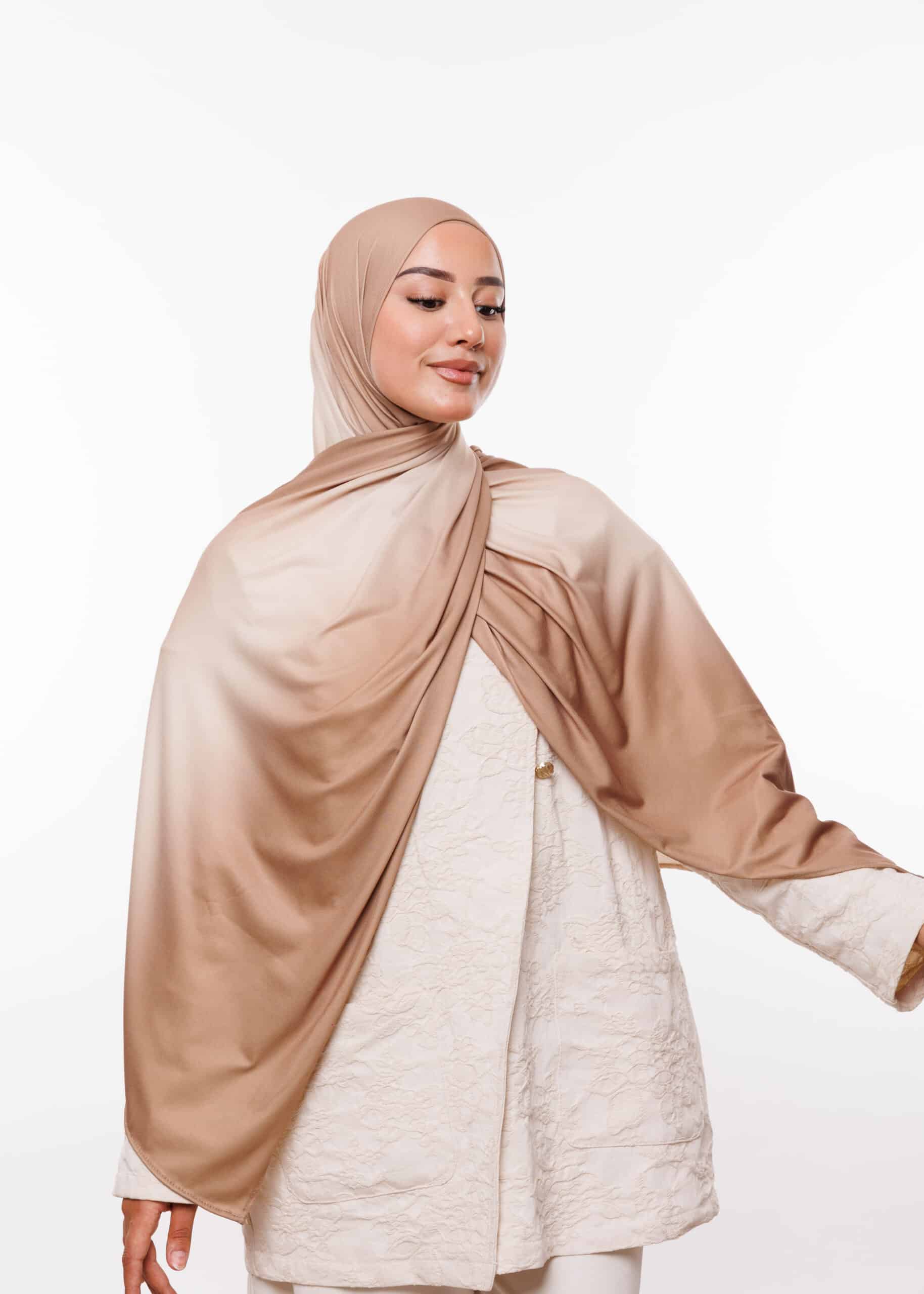 يمكنك ارتداء هذا الشال مع العبايات الخليجية، الفساتين الكاجوال، أو حتى الملابس الرسمية لإضفاء لمسة أنيقة. الألوان المتدرجة تمنحك مرونة أكبر في التنسيق مع مختلف قطع الملابس، مما يجعلها خيارك الأمثل للظهور دائماً بأناقة متجددة.
