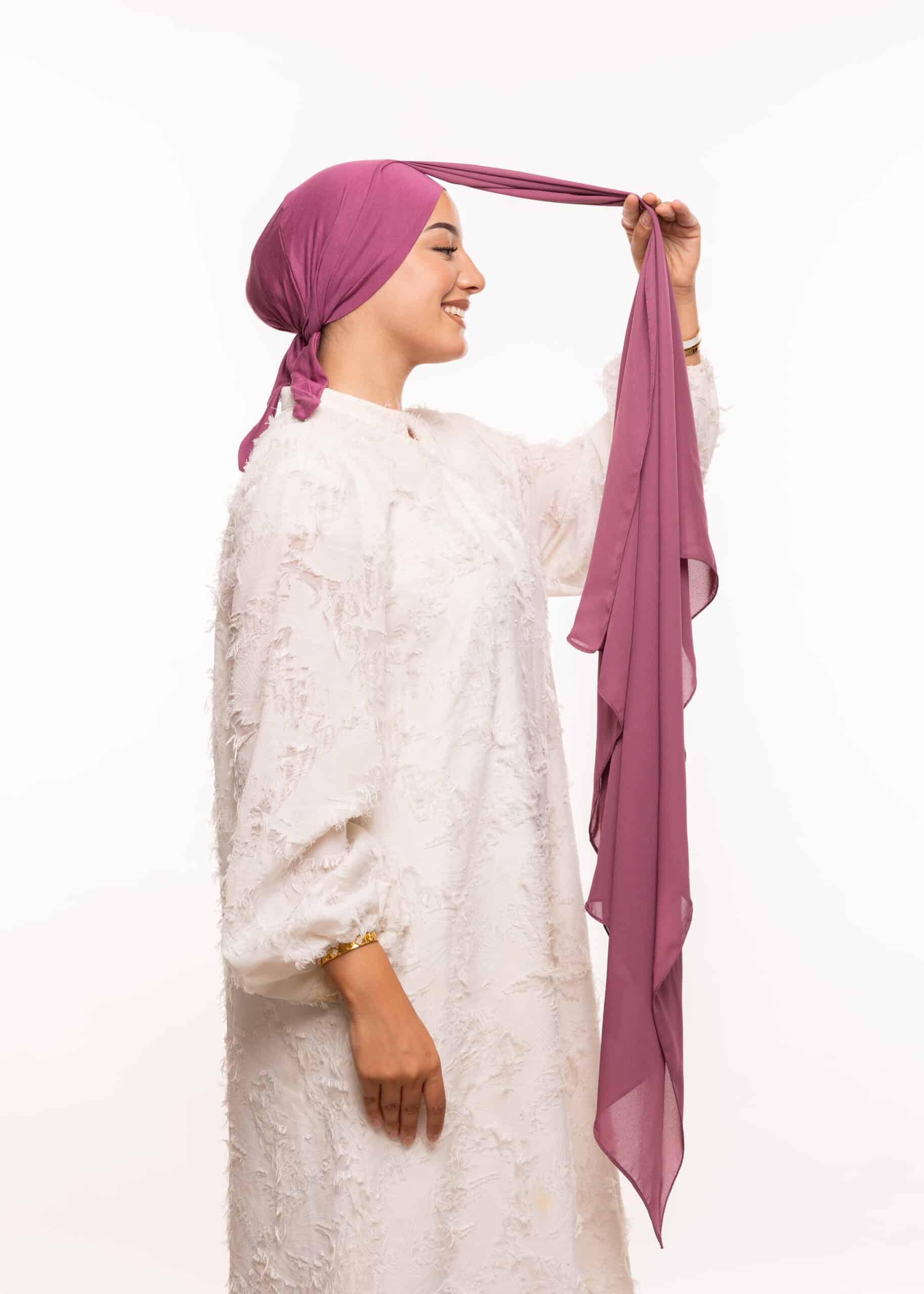 وجود بوني داخلي مدمج يمكن ربطه من الخلف، وهو ما يمنحك ثباتًا إضافيًا أثناء الحركة ويجعل ارتداء شال أمرًا في غاية السهولة، دون الحاجة إلى دبابيس أو مثبتات تقليدية. هذه الميزة تضيف راحة إضافية، خاصة للنساء العاملات أو الطالبات، حيث يمكنك ارتداؤه بسرعة وبشكل آمن يدوم طوال اليوم.