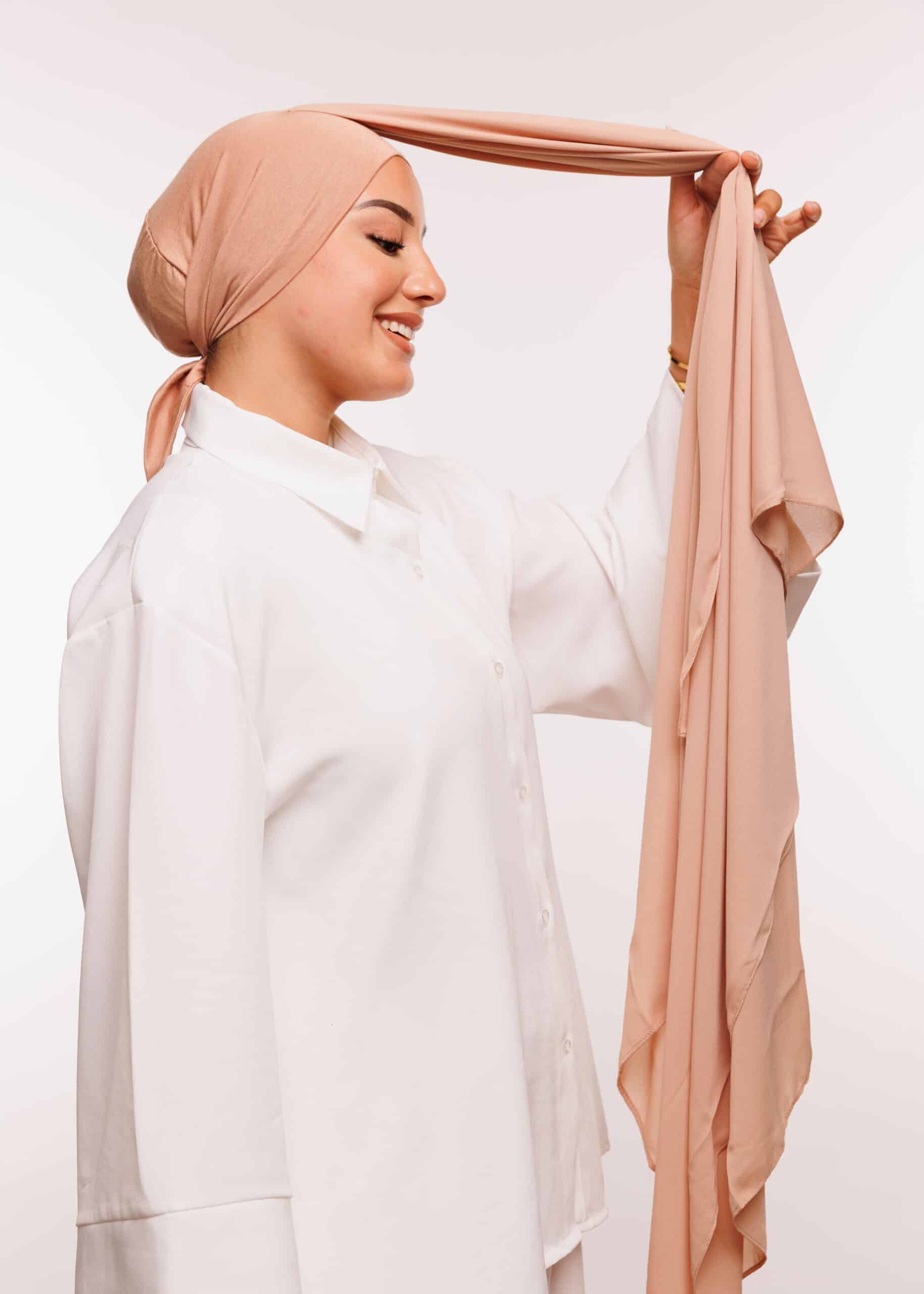 وجود بوني داخلي مدمج يمكن ربطه من الخلف، وهو ما يمنحك ثباتًا إضافيًا أثناء الحركة ويجعل ارتداء الشال أمرًا في غاية السهولة، دون الحاجة إلى دبابيس أو مثبتات تقليدية. هذه الميزة تضيف راحة إضافية، خاصة للنساء العاملات أو الطالبات، حيث يمكنك ارتداؤه بسرعة وبشكل آمن يدوم طوال اليوم.