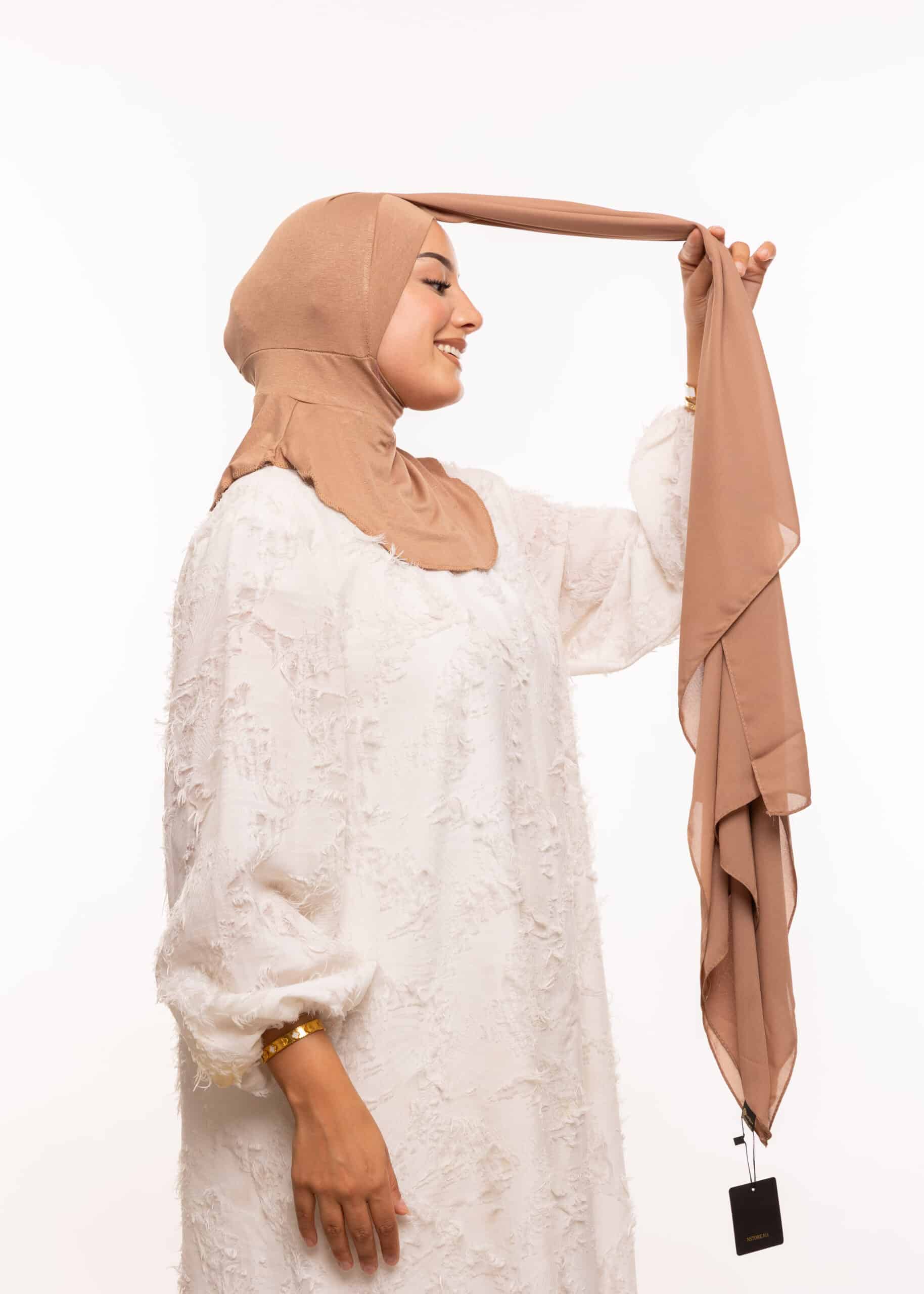 صُنع الثوب من قماش كريب عالي الجودة يتمتع بمواصفات مميزة من حيث المتانة والنعومة والانسيابية. كما أن القُبعة الداخلية مصنوعة من قماش Lycra المعروف بمرونته وتماسكه الجيد على الرأس، مما يجعله مريحًا أثناء الارتداء لفترات طويلة، دون التسبب في انزعاج أو ضغط. القماش الداخلي يساعد أيضًا في تثبيت الحجاب أو الغطاء دون الحاجة إلى دبابيس أو ملحقات إضافية، مما يجعل عملية اللبس سهلة وسريعة.