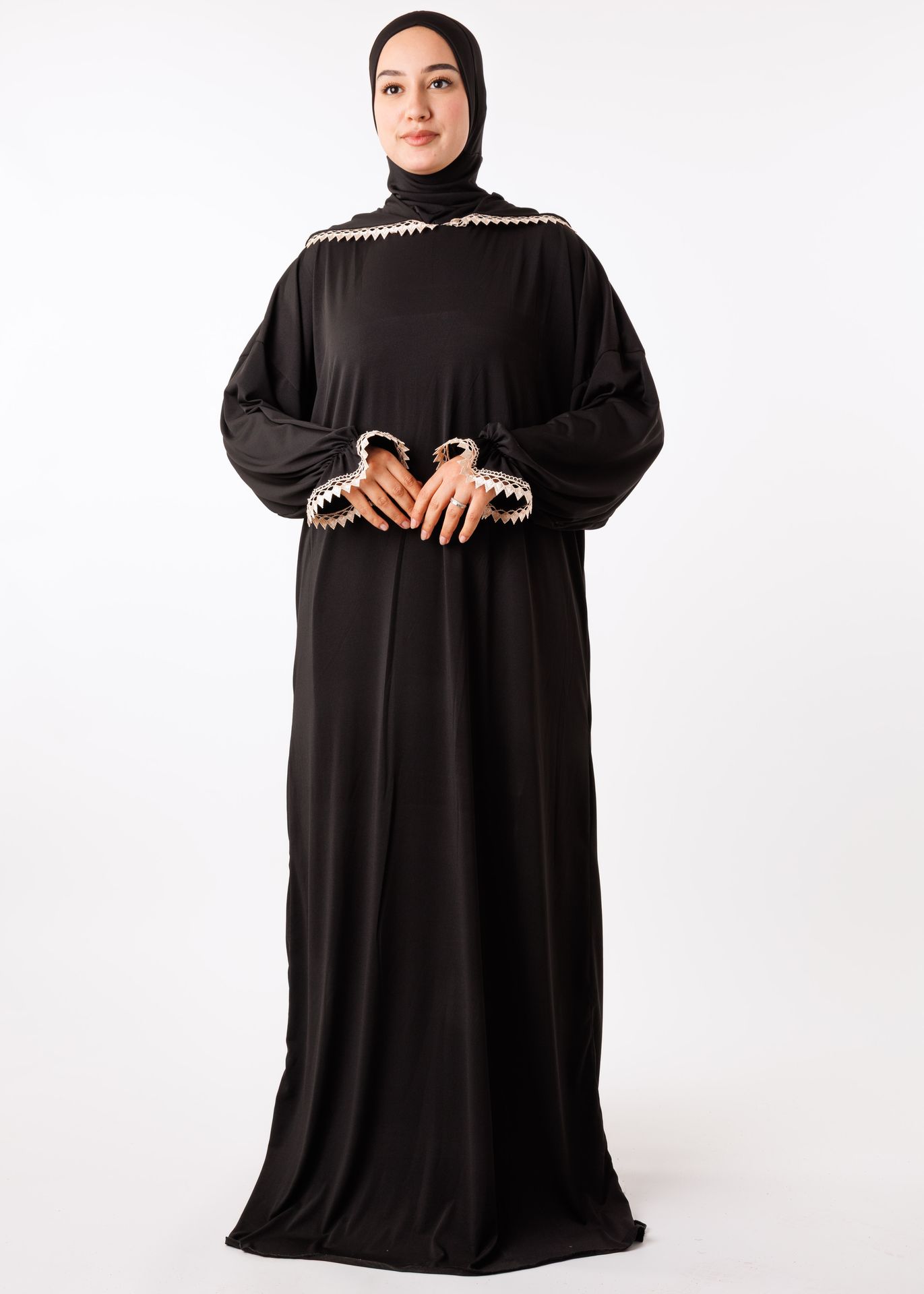 • تطعيمات الدانتيل: يزين الدانتيل الفاخر أطراف الأكمام (المعصم) وحواف غطاء الرأس، مما يضفي لمسة أنثوية ناعمة دون مبالغة، تجعل العباية مناسبة ليس فقط للصلاة في المنزل، بل كـ عباية خروج للصلاة في المسجد، التراويح، أو حتى لاستقبال الضيوف المقربين.