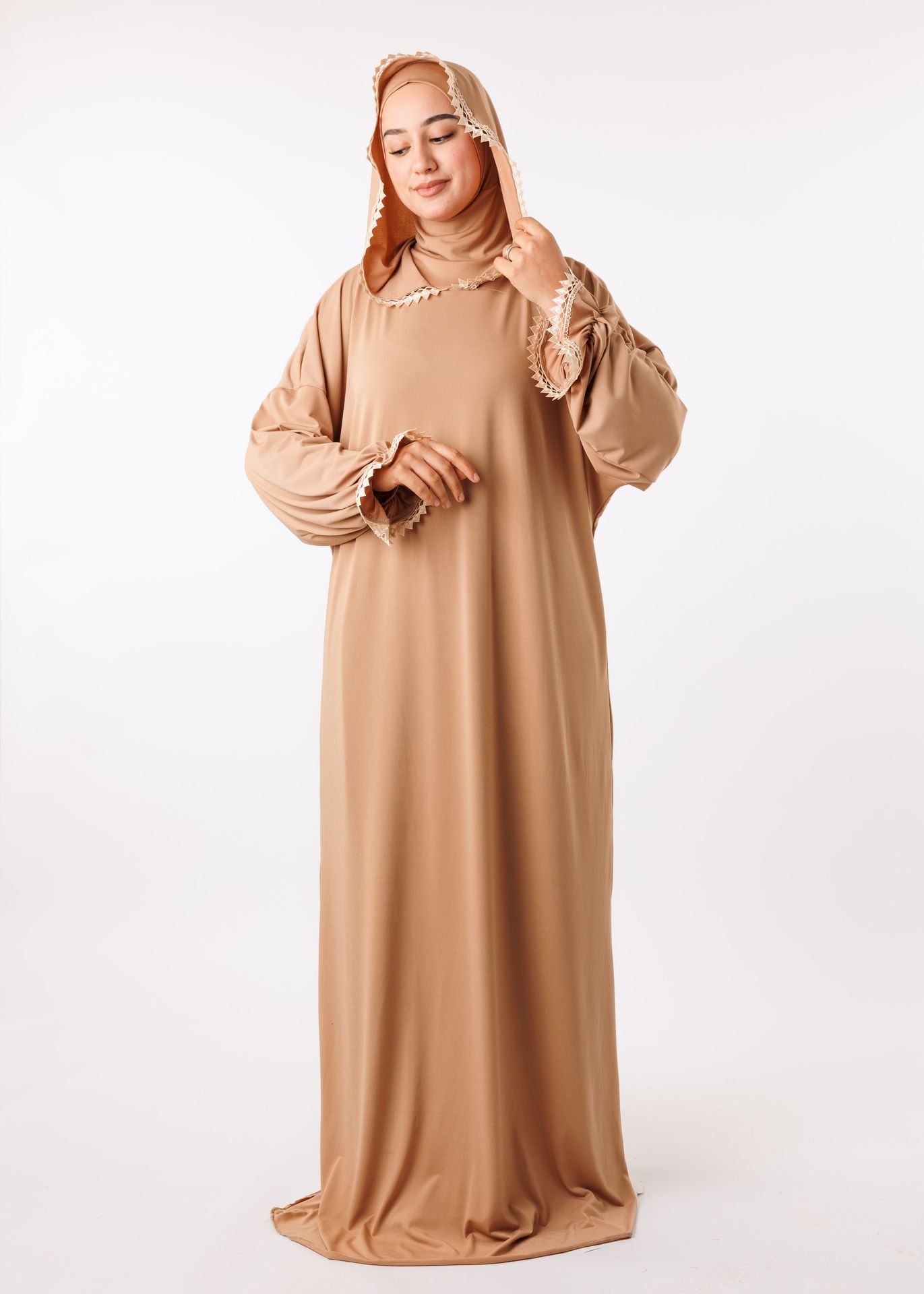 تطعيمات الدانتيل: يزين الدانتيل الفاخر أطراف الأكمام (المعصم) وحواف غطاء الرأس، مما يضفي لمسة أنثوية ناعمة دون مبالغة، تجعل العباية مناسبة ليس فقط للصلاة في المنزل، بل كـ عباية خروج للصلاة في المسجد، التراويح، أو حتى لاستقبال الضيوف المقربين.